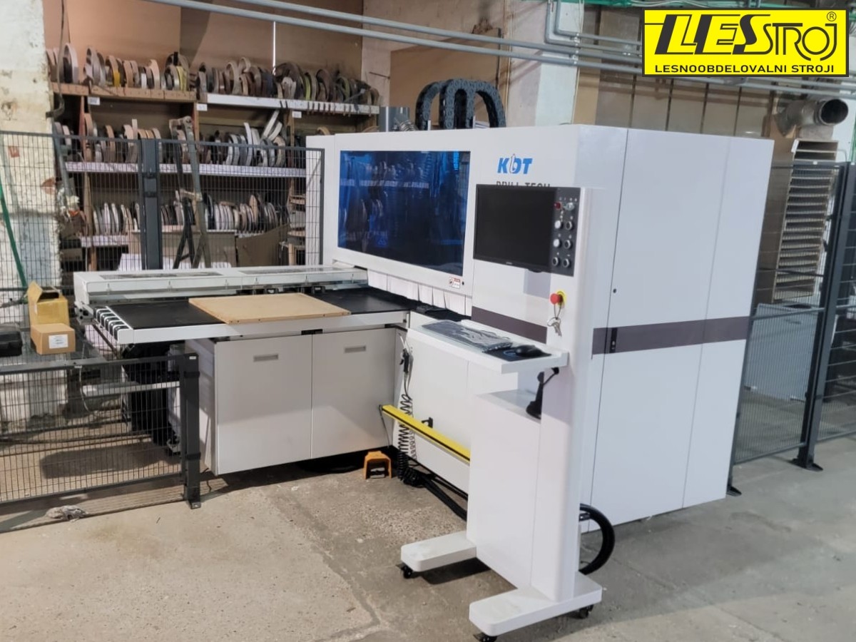 KDT KN-612 NCHSD is an extremely productive throughfeed CNC machine for drilling, routing, and sawing. It features three independent drilling units that allow the processing of two workpieces simultaneously, ensuring high productivity. Two drilling heads are positioned on the top and one on the bottom. One of the advantages of this machine is the side drilling capability with two upper units. The bottom drilling unit is compactly designed to take up minimal space. This reduces the opening in the worktable, providing greater support for the workpiece during drilling, which ensures improved stability and machining accuracy.