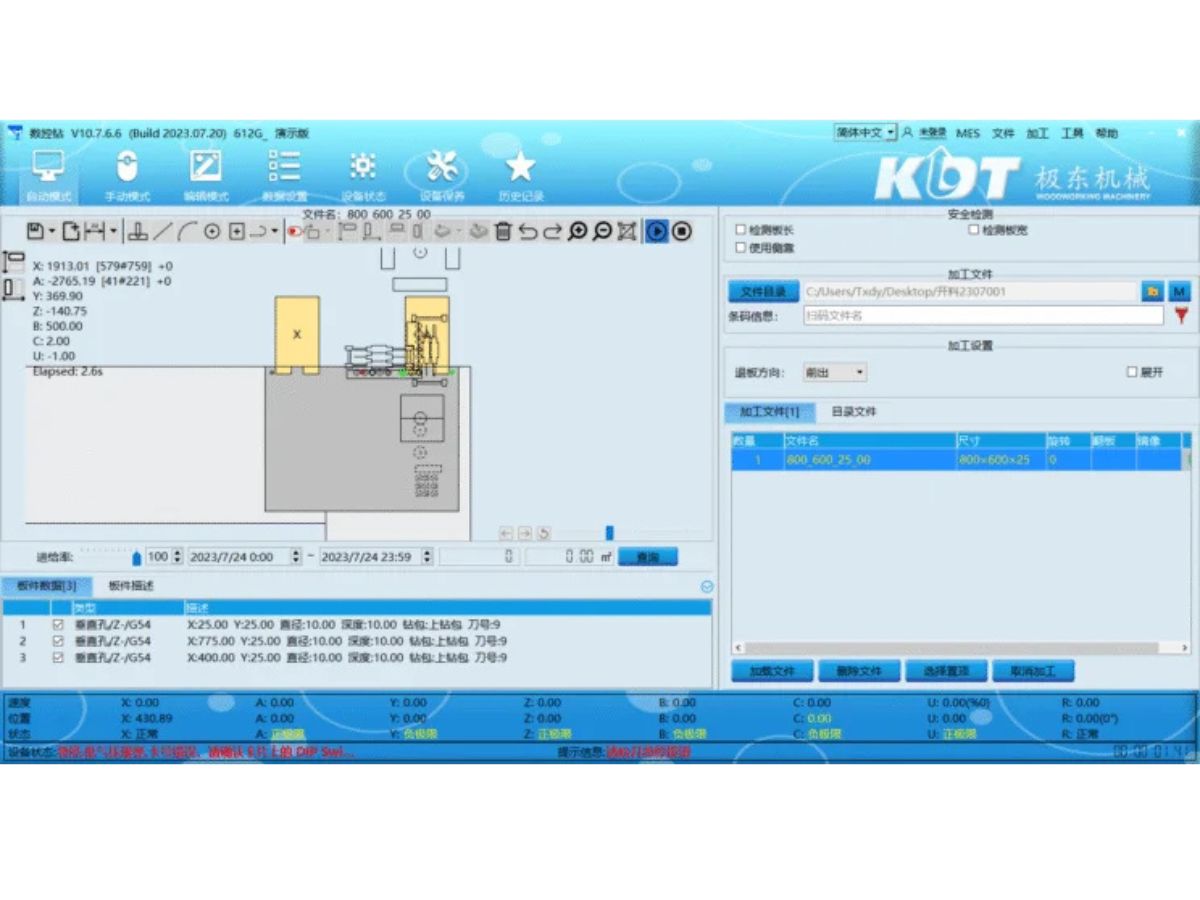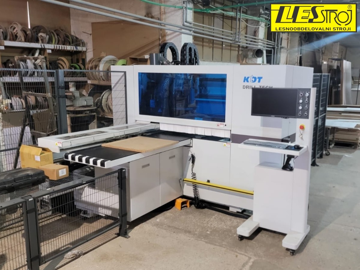 Machine operation is simple via an industrial computer (Windows) and KDT DrillTop software. A barcode reader for working with barcodes is included. The machine supports ONLINE service via TeamViewer, and programs can be created both on the machine and in the office. The package also includes a 1-year LestrojBOX license for automatic furniture creation.
