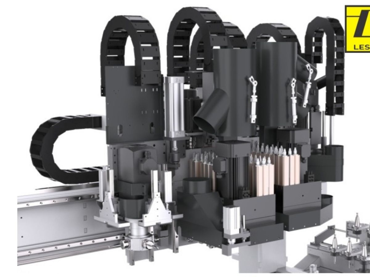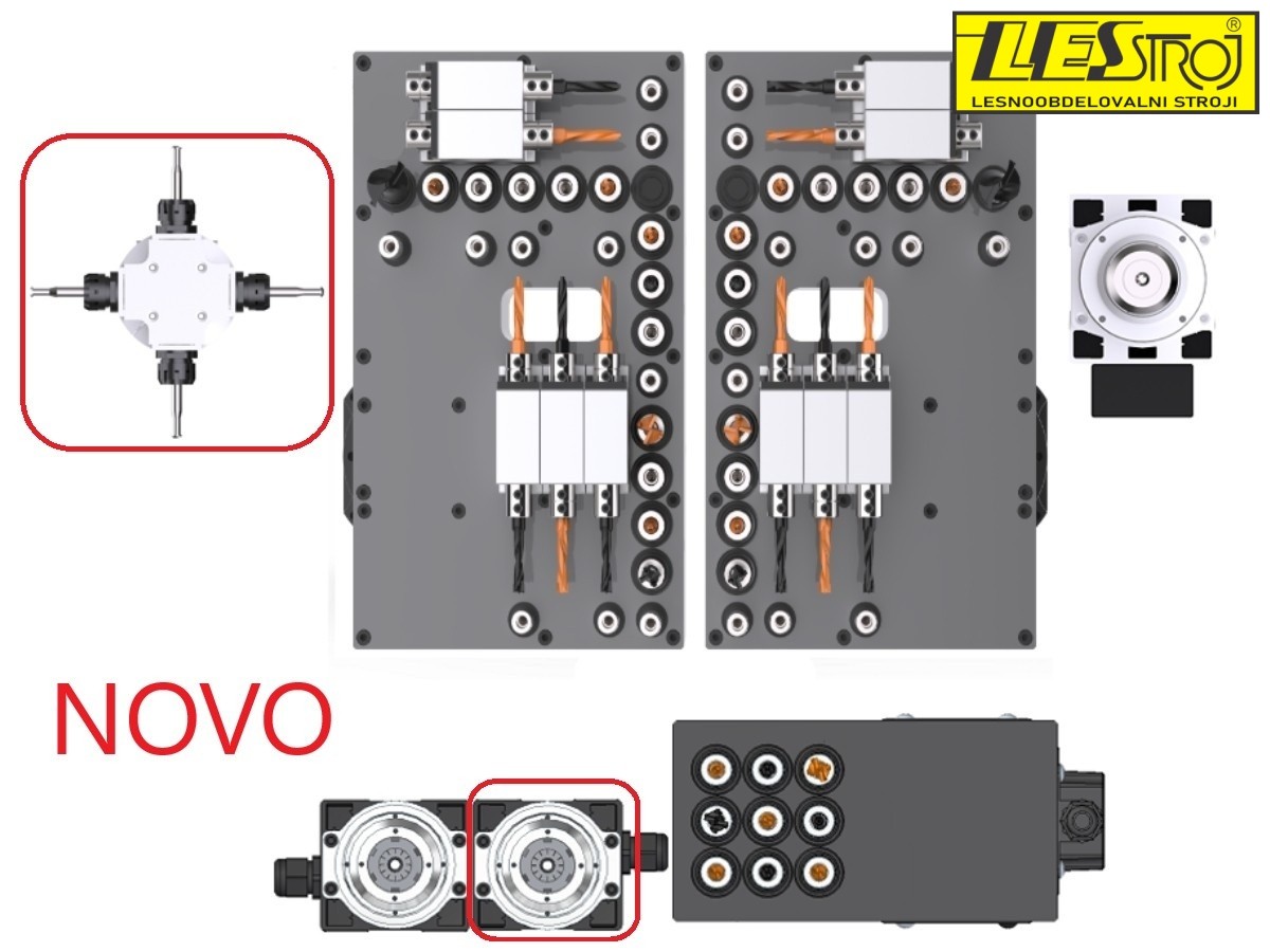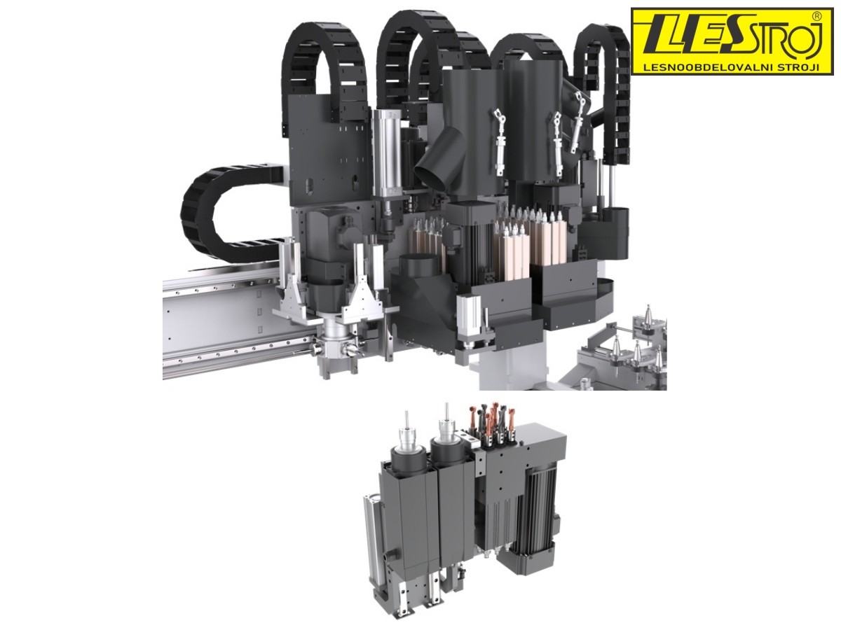 The KN-612 NCHSD also includes four independent routing units for grooves and cutouts on all six sides. A new feature is the 6 kW router with a fixed angular head and four outputs for side grooves from all four sides. An additional fixed bottom routing unit has a manual tool change, meaning there are two bottom routing units for two different grooving cutters. The main upper routing unit (5.5 kW) is equipped with an automatic tool changer with 6 positions.