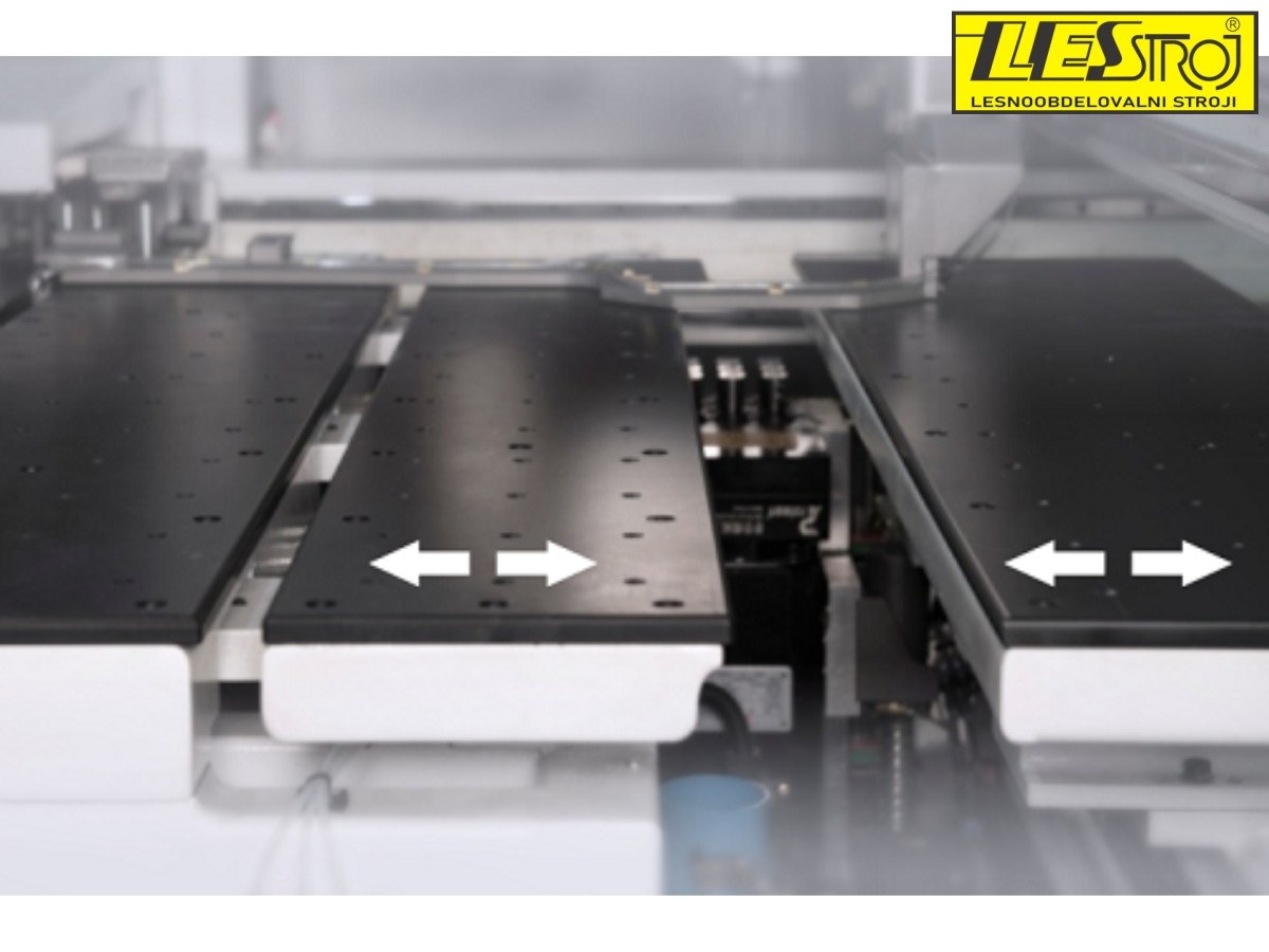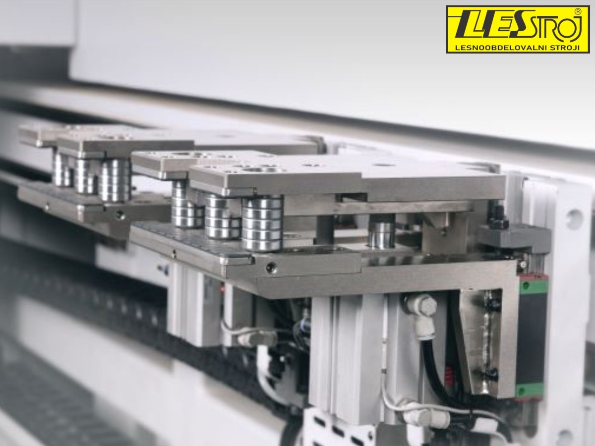 Dual independent clamps enable faster and more precise operation. The clamp rail length is 5500 mm, allowing the machining of long workpieces without re-clamping. The air-assisted infeed table facilitates easy handling of delicate surfaces, while the cross conveyor system ensures smooth outfeed. A conveyor belt removes waste material.