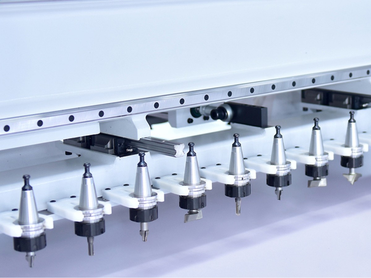 The machine is equipped with a powerful 9 kW electric spindle and a 12-position linear automatic tool changer (ATC), allowing multiple machining operations (cutting, drilling, profiling) without manual tool changes.