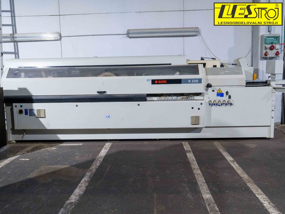 Edge banding machine SCM K208 TERL, year 1999, well preserved and professionally refurbished. The machine is fully equipped with DIA pre-milling units, a pair of end trimmers, rough straight and fine angled milling cutters, a rounding unit with two motors, round profile scrapers, and brushes. Ready for immediate operation and available for inspection in our warehouse.
