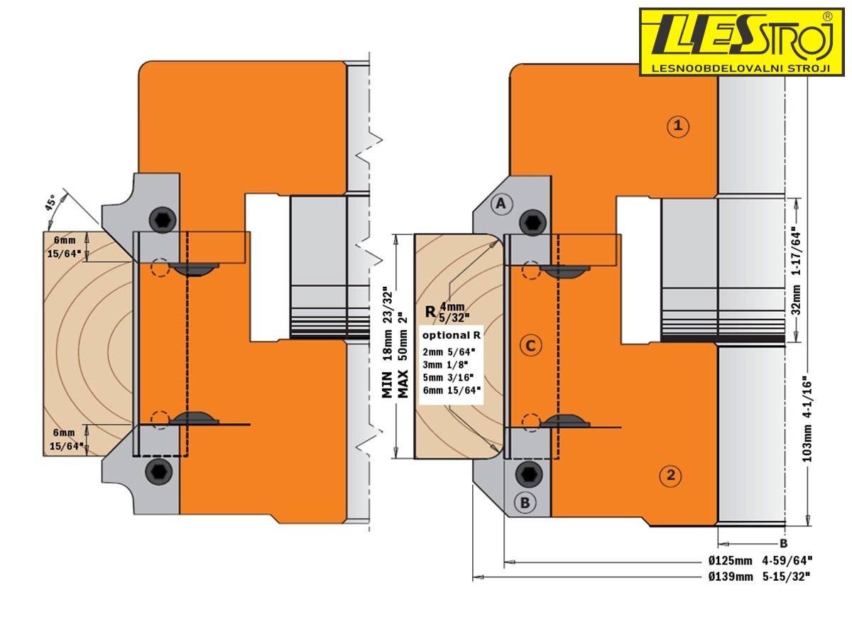 Dvodijelna podesiva CMT glava za glodanje s HM noževima omogućuje obradu obratka po dva ruba istodobno pod kutom od 45° s različitim radijusima i na ravnoj površini između oba ruba u širini od 18 – 50 mm. Glodalica je namijenjena za ručno i strojno uvlačenje obradaka.