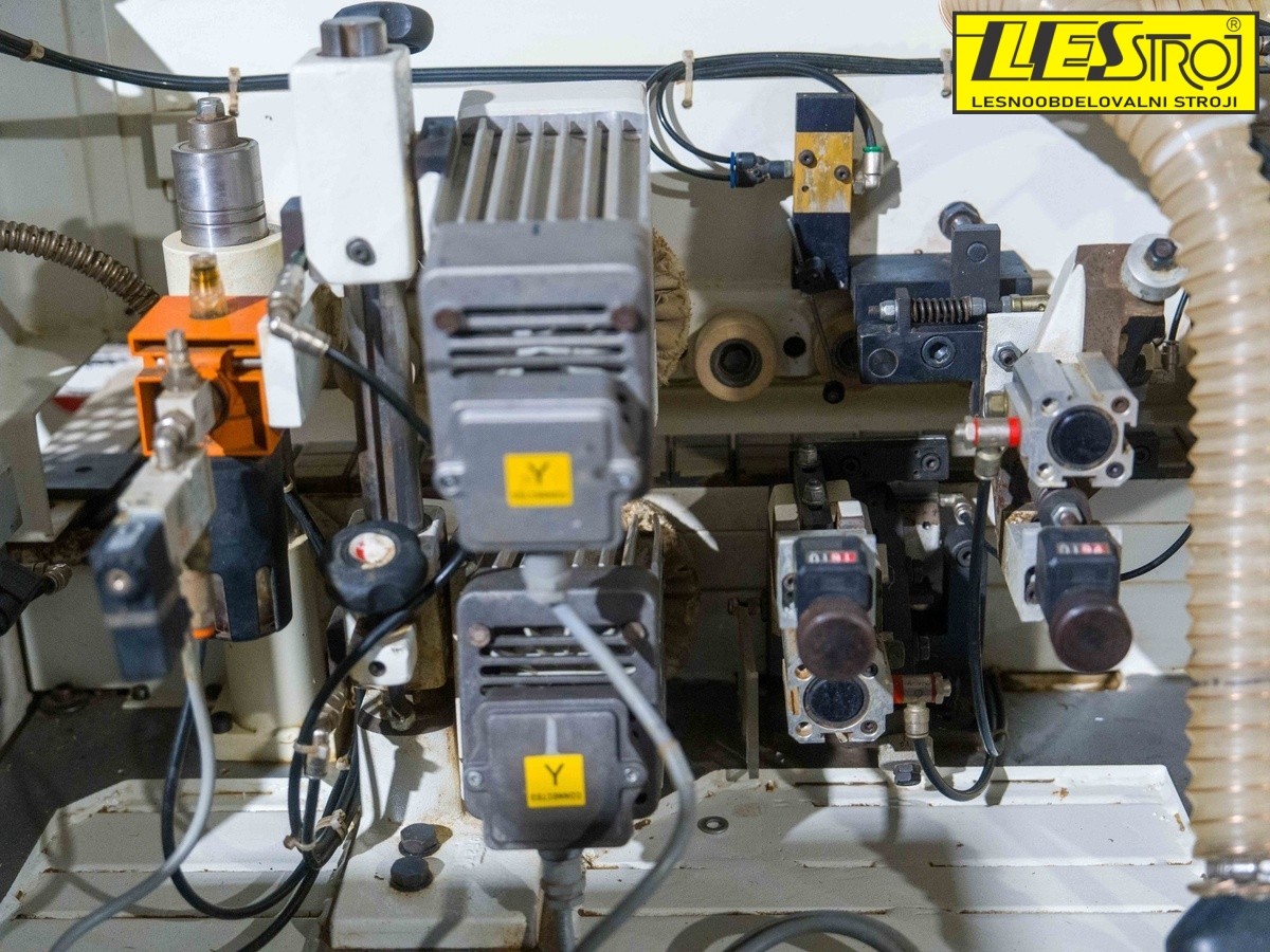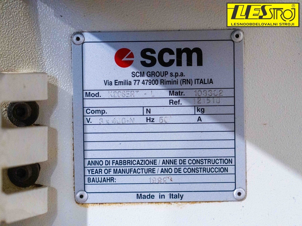 Rubna lijepilica SCM K208 TERL, godina 1999., dobro očuvana i stručno obnovljena. Stroj je potpuno opremljen DIA predglodalicama, parom završnih rezača, grubim ravnim i finim kosim glodalicama, zaobljivačem s dva motora, okruglim strugačima te četkama. Spremna za trenutni rad i razgled u našem skladištu.