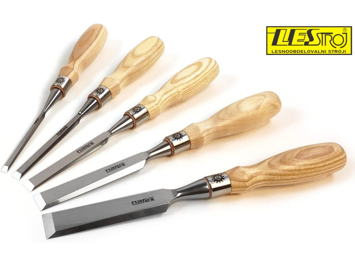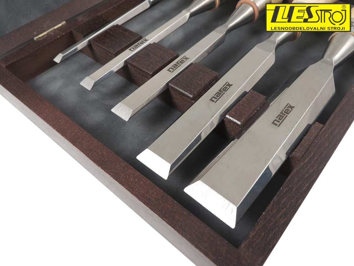 NAREX Richter - 5 delni set ravnih dlet v kovčku iz krom-vanadijevega jekla, ergonomskimi jesenovimi ročaji in robustnim obročem na koncu ročaja iz nerjavečega jekla – idealno za natančno in zahtevno delo z lesom.
