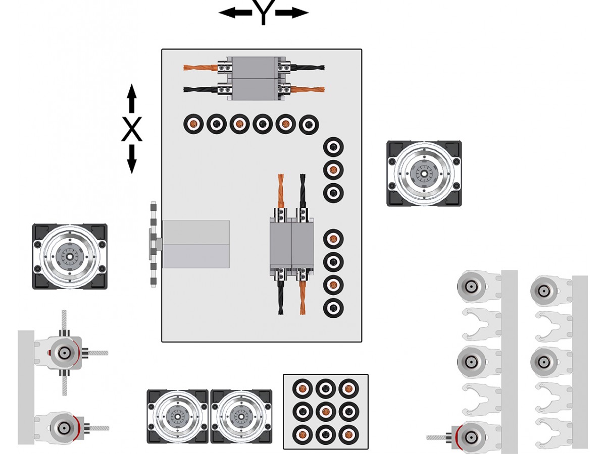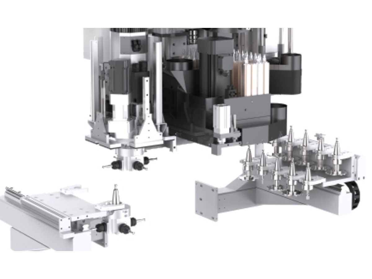 Pri avtomatski menjavi orodja ima 4 osni agregat možnost sočasne menjave 2 kotnih agregatov na levi strani, medtem ko ima desnih dodatni rezkalni agregat zalogovnik z 10 pozicijami za orodja.