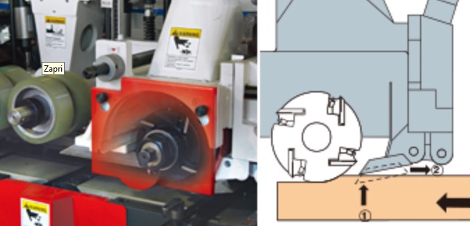 Podajalni valji nasproti levega vretena so nastavljivi glede na širino obdelovanca. Ta naprava je primerna za proizvajalce lesenih talnih oblog in okvirjev.