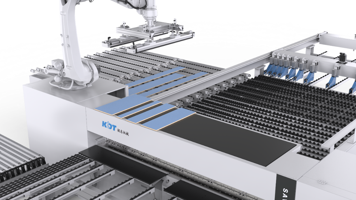 Avtomatska razrezovalka z robotsko roko KS-533A je zasnovan za proizvodnje, kjer štejeta hitrost in ponovljivost. Industrijski robot poskrbi za stabilno rokovanje s ploščami, predzlaganje in vmesna (buffer) cona pa omogočata boljši pretok in manj zastojev. Celovit sistem nadzora prahu izboljša čistočo delovišča, odpadni material pa se avtomatsko zbira in odvaja. Natančnost rezanja in pozicioniranja se izboljša z vodeno poravnavo ter stabilnim vpenjanjem (dvojna tlačilna nosilca), zaključek procesa pa dopolni avtomatsko etiketiranje za boljšo sledljivost in urejen izhod izdelkov.