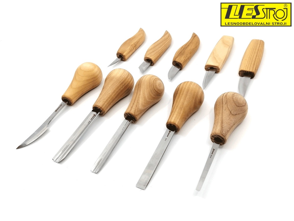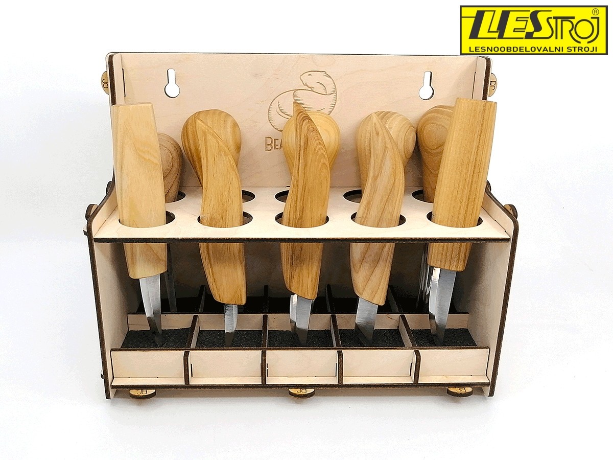 Set 10 rezbarskih dlet in nožev skupaj z lesenim stojalom. Set je namenjen za bolj zahtevne uporabnike, ki potrebujejo večje število rezil in si želijo tudi lep prostor za shranjevanje rezil.